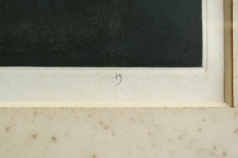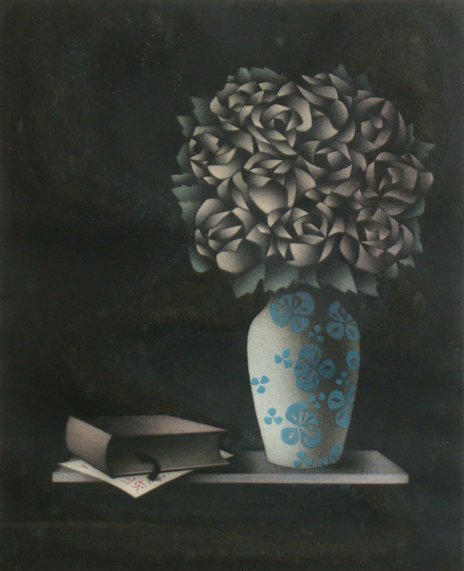 そのメゾチントの技法を用いて、陰影の美しい作品をたくさん制作している彼の作品は日本人にもとても馴染むもの。花瓶の花の淡い色彩、本の下のメモにはなぜか漢字が入っているよう、ひょっとすると何かへのオマージュなのかもしれません。下部マージンにあるフランス語のタイトルを翻訳してみると「中国語で書かれた手紙」とありました。そう云えば花瓶も染付のようですし、なにか東洋のエキゾチックな魅力への憧れのようなものが隠されているのかもしれませんね。