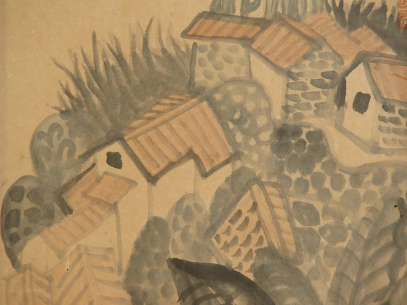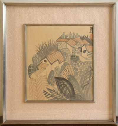 何処か異国の風景を描いたものと思われますが、さてどこか?一時期、氏が活動拠点にしていたメキシコなのか、それともアジアの国なのかはわかりませんが、石垣と植物を淡彩で描いていますね。特有のデフォルメによって描かれた小さな村の中に豊かに実る植物、のんびりとした風景と太く柔らかい線に、なにか言いようのない温かみを感じるのは私だけではないと思います。