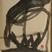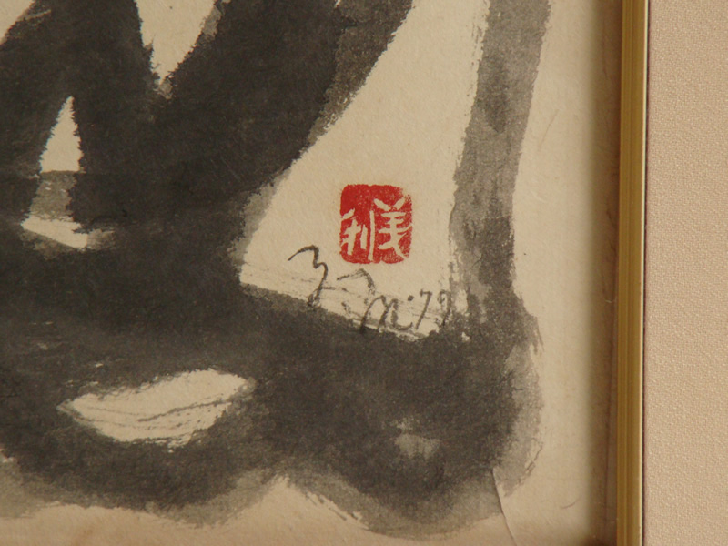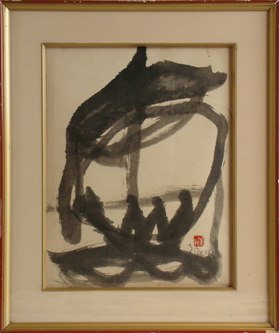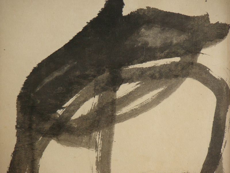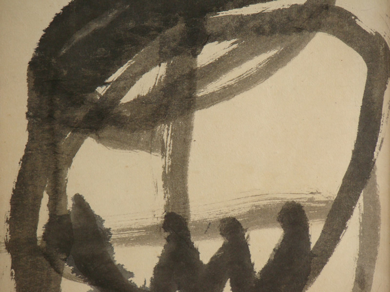 森義利さんはもともと友禅染めのお仕事をなさっていたようで、自ら合羽摺りという技法を工夫され、芝居絵や役者の大胆な動きを表現されてきました。柳宗悦に師事したことが氏の大きな転機になったようで、版画を始めたのも50才を過ぎてからのことだそうですが、それにしても躍動感のある筆使いですね。作品にも表れる力が、この絵にもこもっています。顔を表現したもののようですが、細かいディテールにこだわることなく、太い筆で書きなぐったと云うような、力が溢れる墨の作品です。