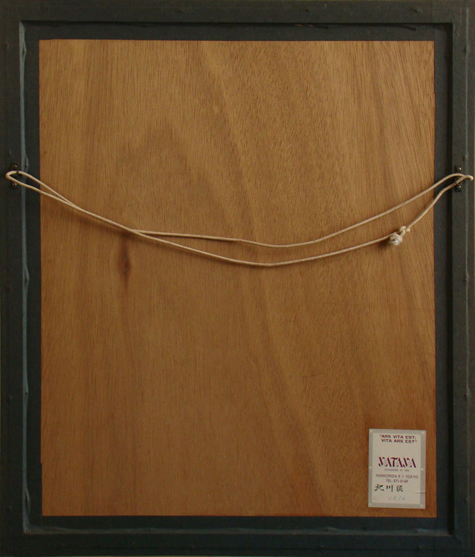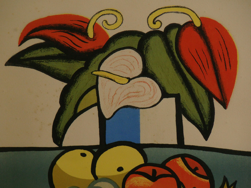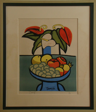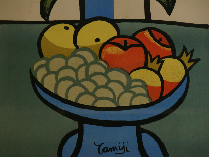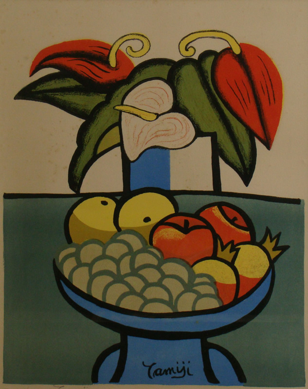 明快な静物の色の構成と配置、それらをまとめる力強く太い線の主張、もう何もコメントのしようもないというくらい、ストレートに訴えかける作品です。アンスリウムが活けられ、手前のテーブルにはフルーツが盛られていますね。長谷川潔さんの「白昼に神を視る」ではないけれど、静物ひとつひとつに神秘的な隠された意味があるのかも?それともメキシコの強烈な太陽光のもとですごした作者にとって、色彩の配置が心地よいリズムになって、私たちのもとへ届く事を願っての絵なのか?どちらもありだなと思える作品ですね。