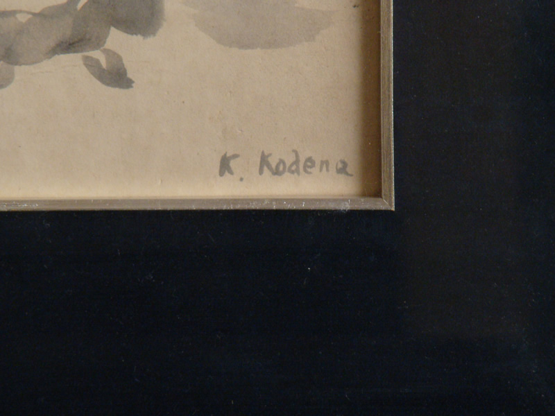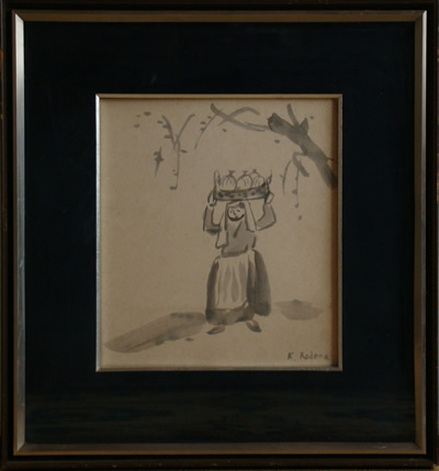小寺健吉の小品ですね。淡い炭で大原女を描いています。頭の上にのせているのは果物かな?バックには柳の木が配されています。色紙に描かれたものですから、作者も気張らずに鼻歌まじりに自由に筆を走らせたんでしょう、それだけに軽みのある絵に仕上がっています。童画のような素朴な人物を、作者にならって気張らずに飾って頂けたらと思います。