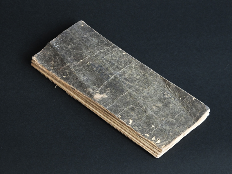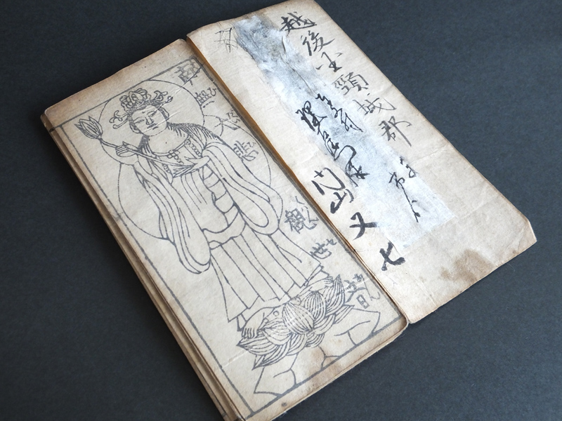これは新潟県で出たもの、表紙の見返しには頸城郡の地名があります。裏側の紙の継ぎ目には天保4年の文字があり、その頃作られたものというのがわかります。大切な経典を少しでもきれいに装飾しようとしてのことか、紙の表面にはキラ摺りと呼ばれる雲母の粉を蒔いていますね、これは他の経典にも見られるところです。最後の部分には大阪海屋町、日吉信久版とあり(誤字があるようです。)そこで摺られたものでしょう。墨でいたずらしたのか文字に加筆があるのと、絵経文の前後に文字で書かれた序文や奥書がもしかしてオリジナルの状態ではあったかもしれませんが、現状はない状態です。