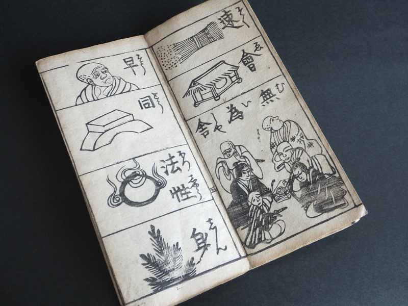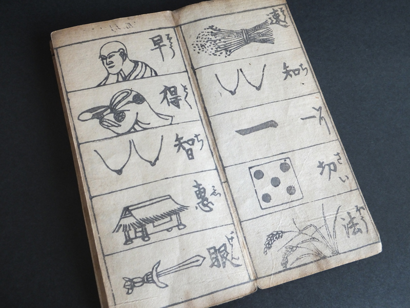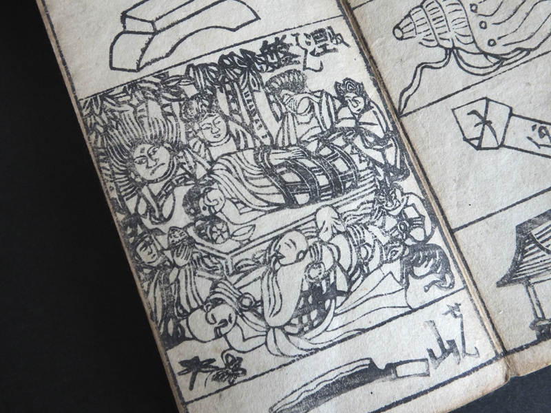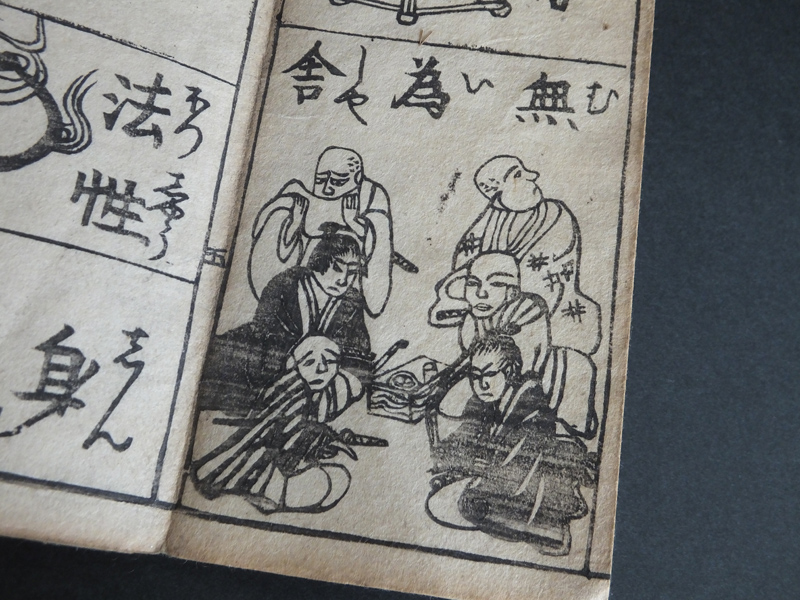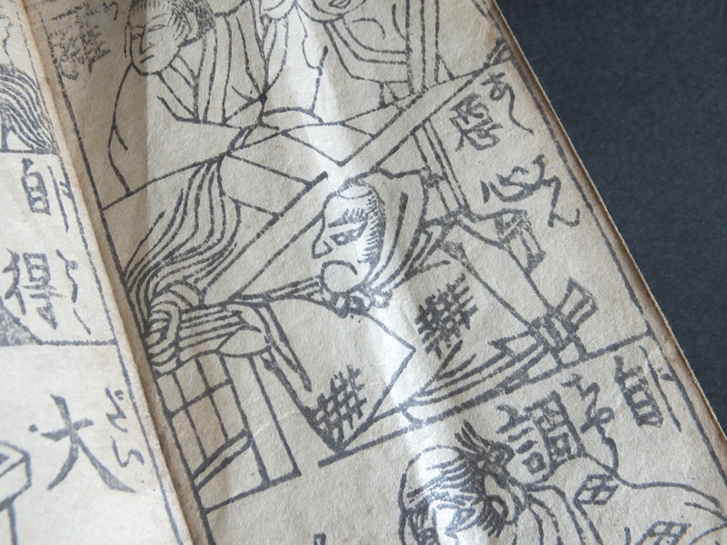 さて今回皆さんにご紹介するこれは、めくら経と云って、暦ではないのですが同じように文盲の人々にも仏のおしえを平易にわかりやすく伝え、主に般若心経が多かったようですが、その経文を唱える手助けのための印刷物でした。
