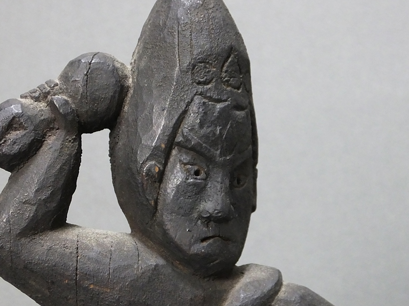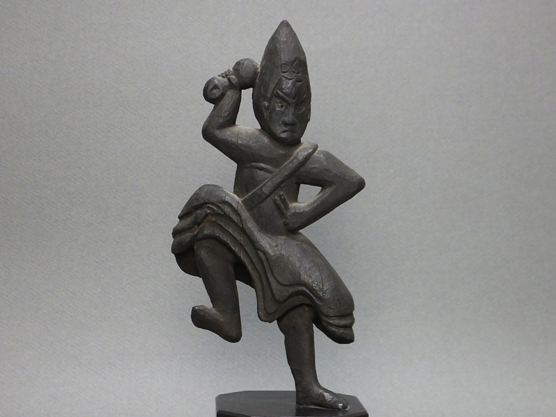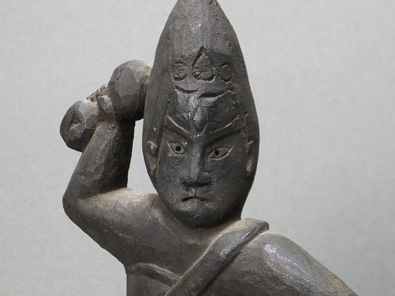 造像のお手本が書物であったようで、あまり三次元の造形意識というのがなく、ぎこちないような作り方ですが、それだけに 素朴で微笑ましい表現になっています。お顔も本来は憤怒形で怖いものに作るところ、腕白な童子のお顔のような 愛らしさが見てとれます。持っている五鈷杵もあまり細かい表現は難しかったようで、かなり簡略化されて鉄アレイのような 形がまた面白いところです。