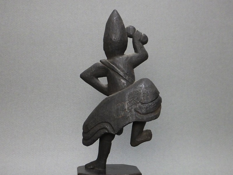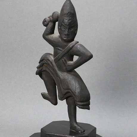 いくつか異形もあるようですが、多くはこのように左手で印を結んで腰にあて、右手は密教法具である五鈷杵を高く掲げ、片脚を上げた 躍動感あふれるかたちで表わされます。平安時代から木彫や金銅製の像がたくさん作られ、紹介されてきましたので、ご興味のある 方なら図録等で目にしたことも多いと思います。