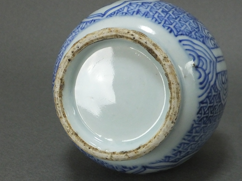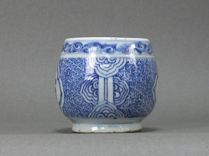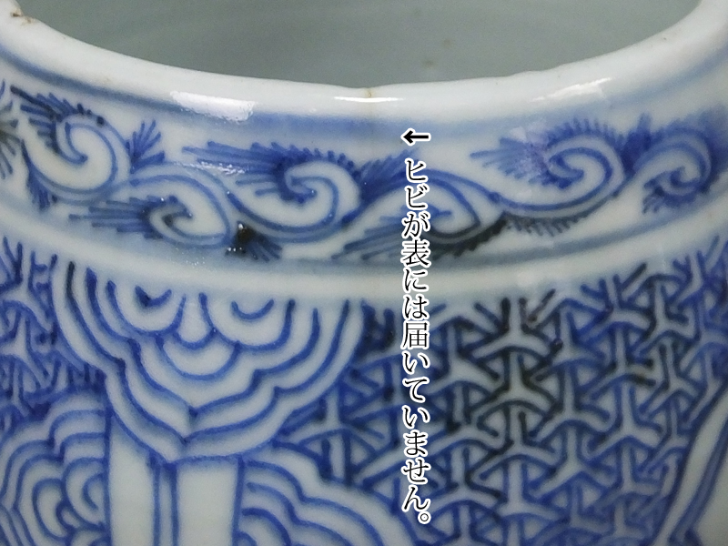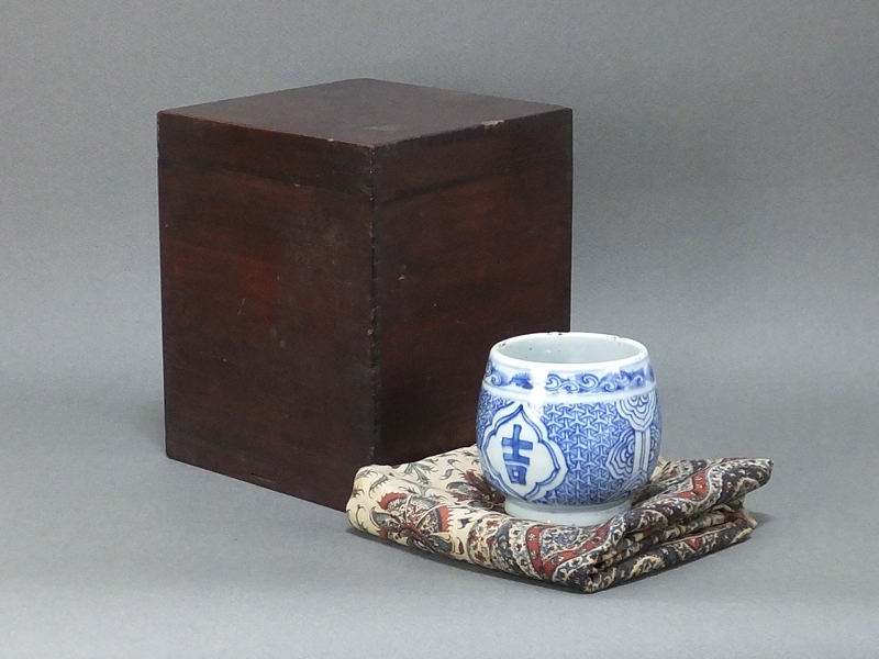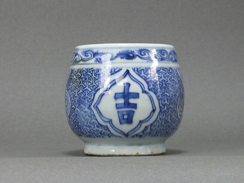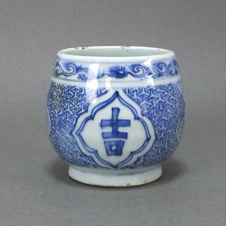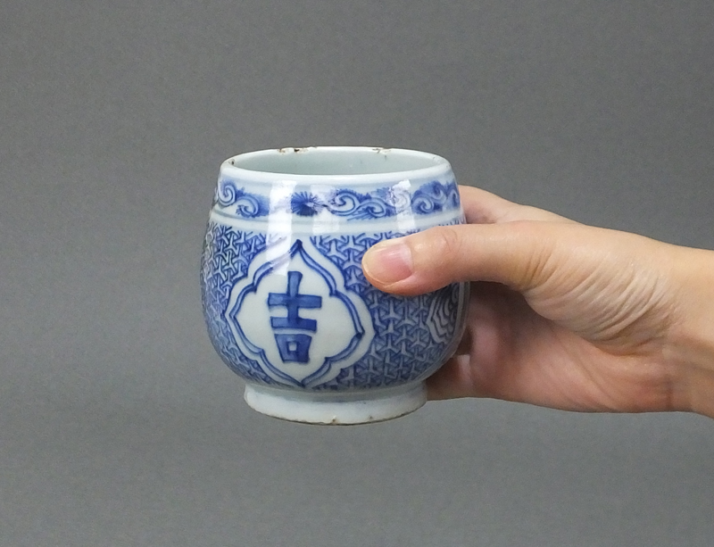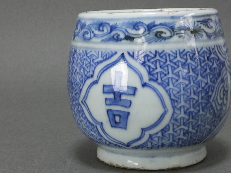 地紋様を毘沙門亀甲で埋め尽くし(古九谷などにもよく写された文様ですね)雲形の窓には大きくおめでたい吉の文字が配されています。その呉須は見事な発色で乳白の素地と相まって美しい表情を見せてくれています。
