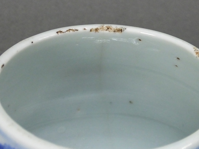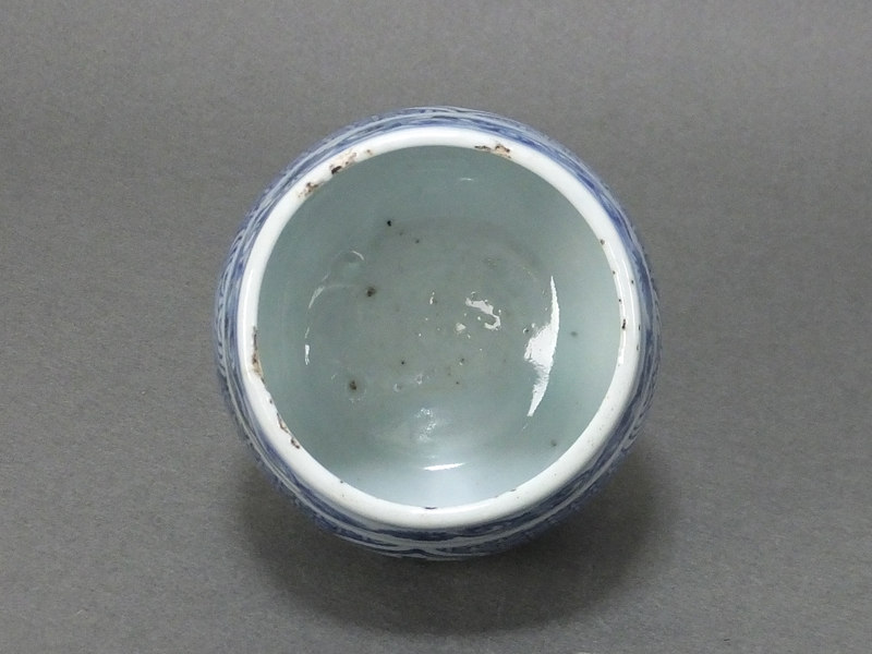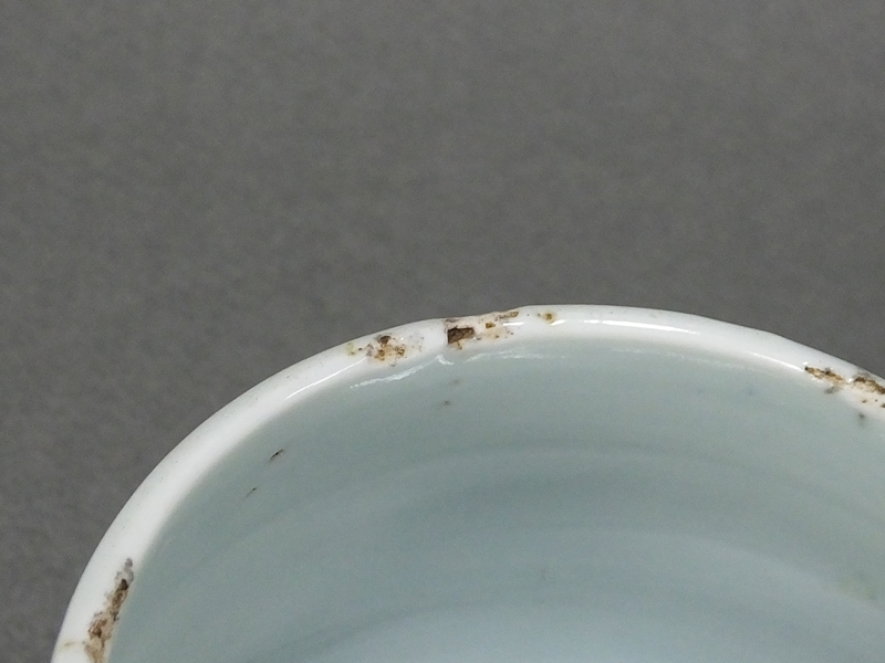 器形はやや内抱えで口縁には虫食いがあちこちにありますね。そのひとつからニュウのように見えるものが見込みに走っています。たしかになにか衝撃が加わってクラックは入ってしまったのだとは思いますが、反対側の釉層にはルーペで仔細に観察しても見られません。弾いてもまったく鳴くような音もしませんし、結局のところ、内側の釉層と素地にはニュウが入ってしまったけれどごく薄いものだったので、外側の釉層には響かなかった、したがって磁貫ということになりますでしょうか。ですから厳密に云えば疵ということになるのかもしれませんが、通常のニュウより程度のずっと軽いものと理解して頂ければいいのではないかと思います。もちろんお使いになるのに何の支障もないことは云うまでもありません。