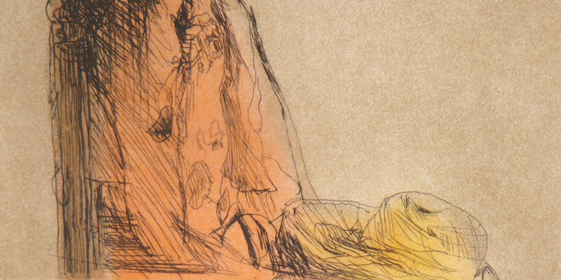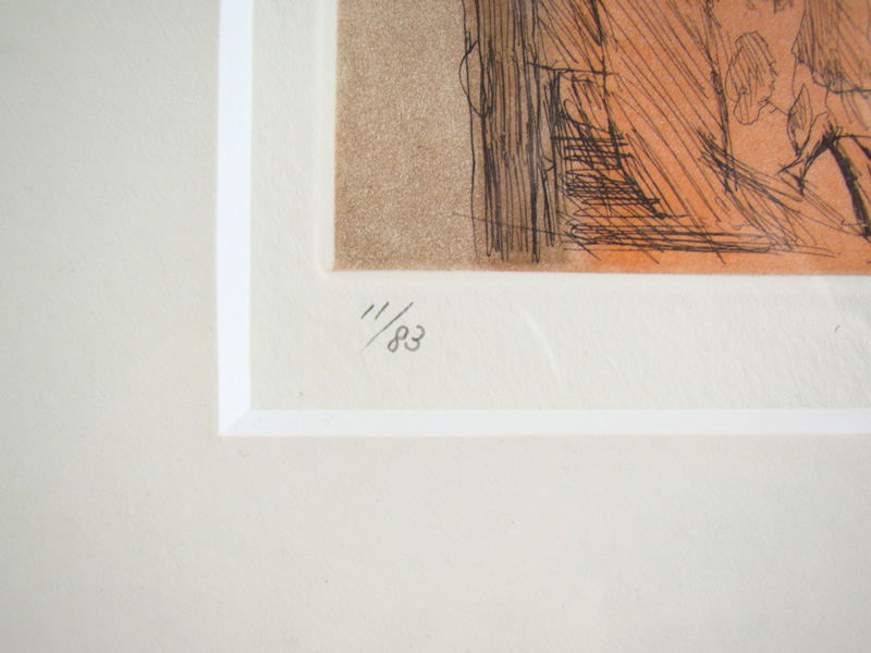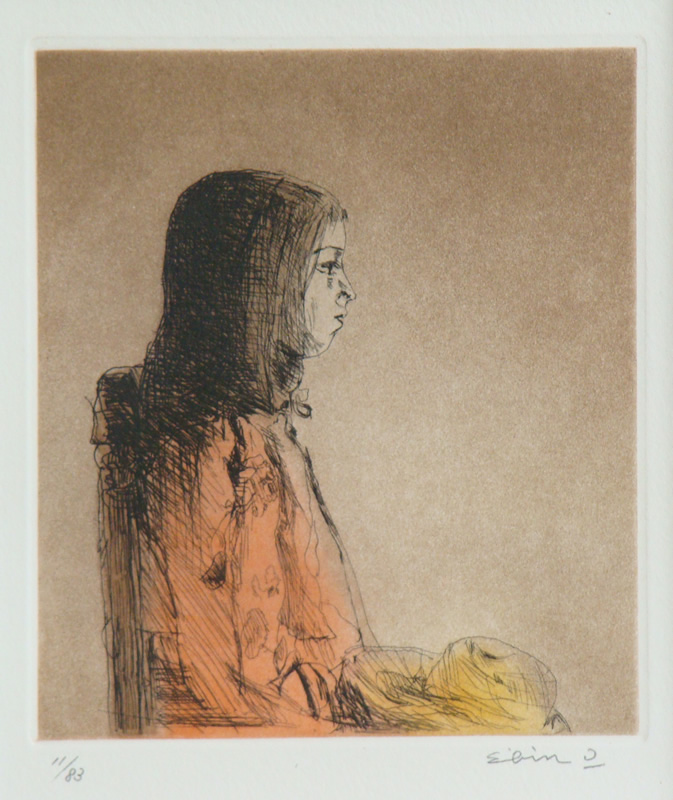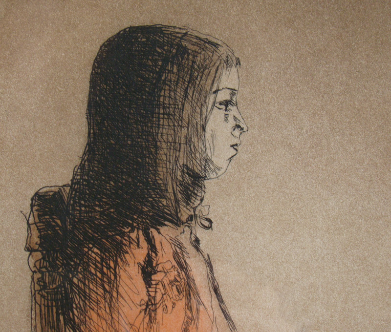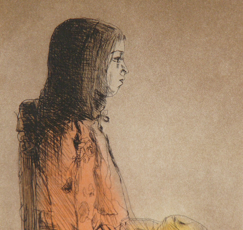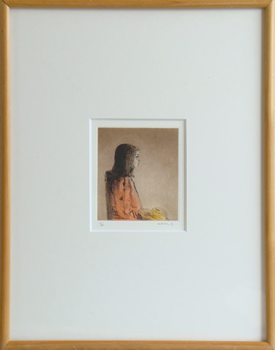 大津英敏さんはご自分の娘さんをモデルに描き続けていることで有名な方ですね。この作品もそのひとつと思います。帽子を手にする少女の姿を、エッチングの技法を用いて表現しています。