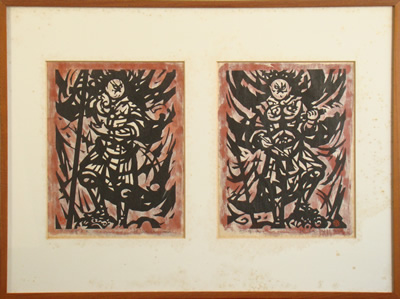 シンプルで力強い線で構成された四天王、その内の増長天と広目天が二体一組に額装されています。邪悪なものや怠惰、誘惑に負けやすい弱い心を払い、煩悩を焼き尽くす炎のような視線は迫力がありますね。氏の作品の魅力、面目躍如たる一品です。
