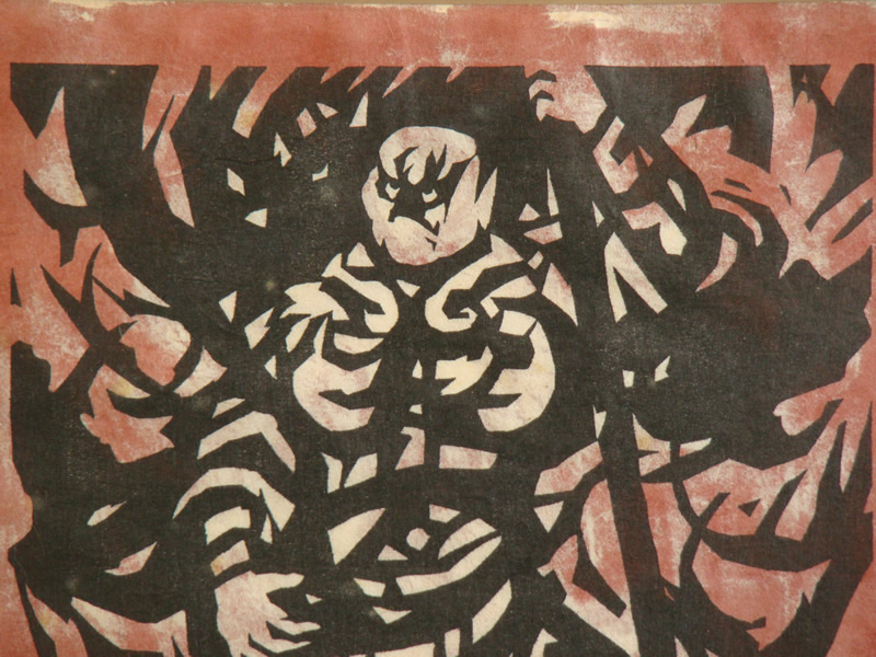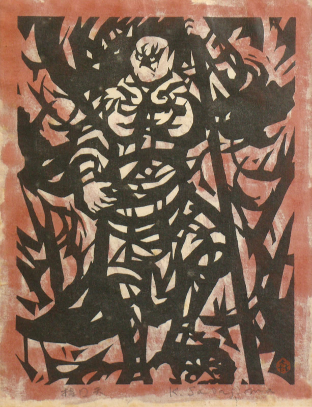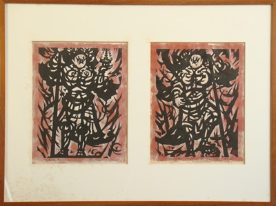こちらも笹島喜平さんの板画です。先にご紹介したものの連作で、こちらは持国天と多聞天を二体一組にして額装しています。