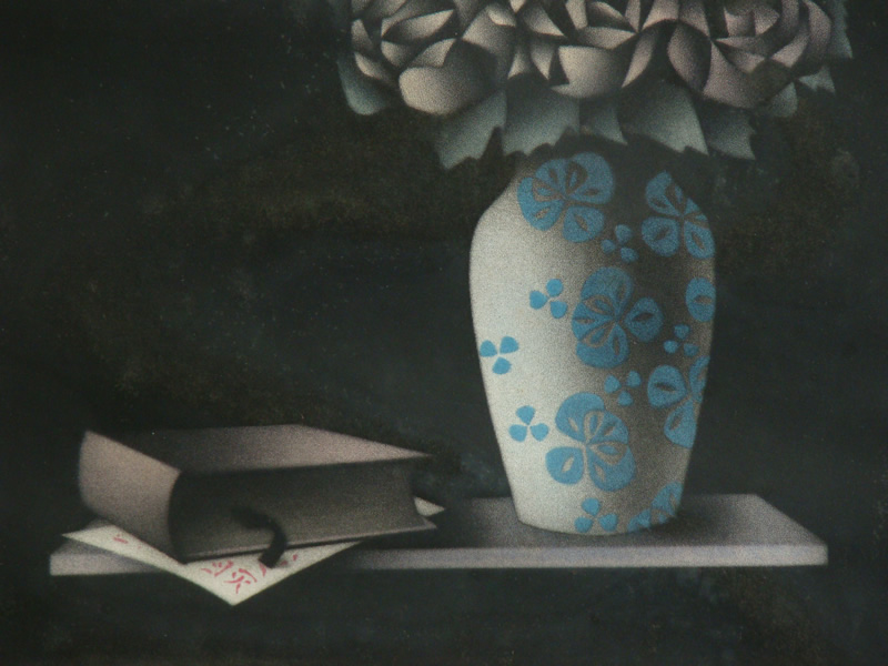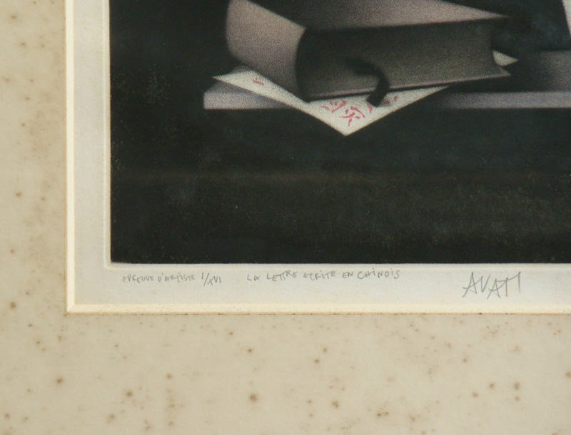 そのメゾチントの技法を用いて、陰影の美しい作品をたくさん制作している彼の作品は日本人にもとても馴染むもの。花瓶の花の淡い色彩、本の下のメモにはなぜか漢字が入っているよう、ひょっとすると何かへのオマージュなのかもしれません。下部マージンにあるフランス語のタイトルを翻訳してみると「中国語で書かれた手紙」とありました。そう云えば花瓶も染付のようですし、なにか東洋のエキゾチックな魅力への憧れのようなものが隠されているのかもしれませんね。