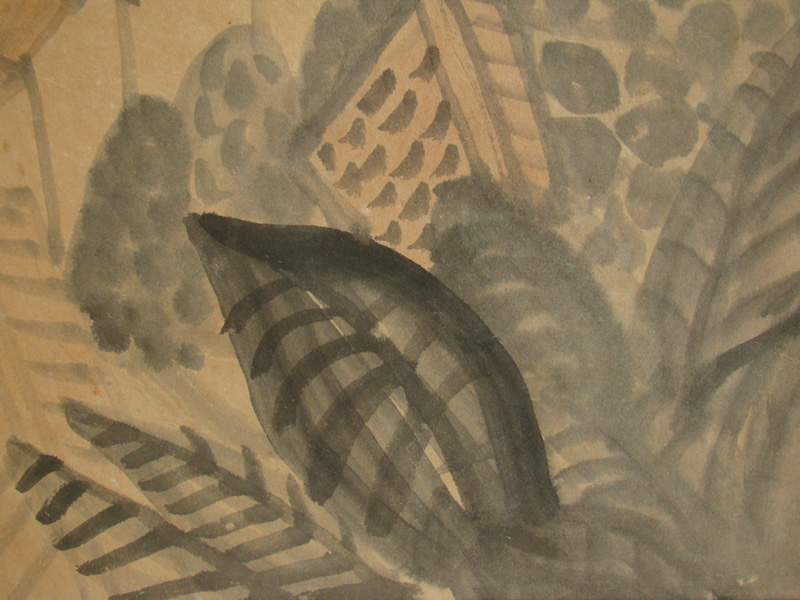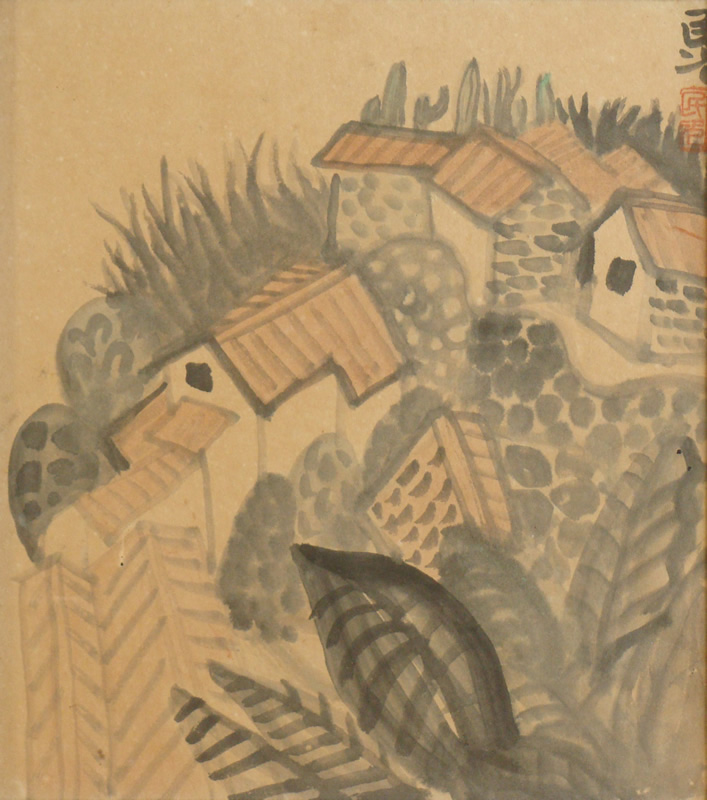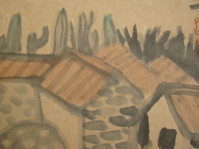 何処か異国の風景を描いたものと思われますが、さてどこか?一時期、氏が活動拠点にしていたメキシコなのか、それともアジアの国なのかはわかりませんが、石垣と植物を淡彩で描いていますね。特有のデフォルメによって描かれた小さな村の中に豊かに実る植物、のんびりとした風景と太く柔らかい線に、なにか言いようのない温かみを感じるのは私だけではないと思います。