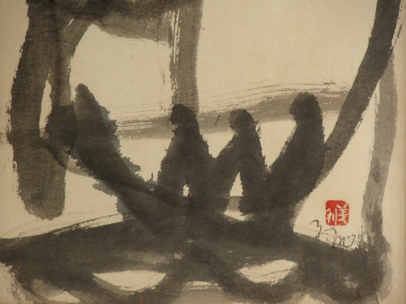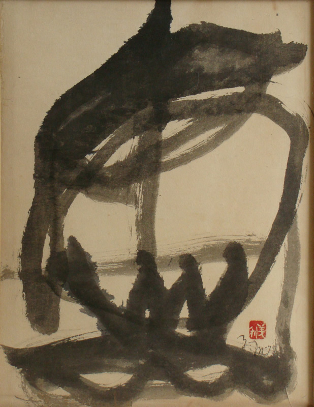 森義利さんはもともと友禅染めのお仕事をなさっていたようで、自ら合羽摺りという技法を工夫され、芝居絵や役者の大胆な動きを表現されてきました。柳宗悦に師事したことが氏の大きな転機になったようで、版画を始めたのも50才を過ぎてからのことだそうですが、それにしても躍動感のある筆使いですね。作品にも表れる力が、この絵にもこもっています。顔を表現したもののようですが、細かいディテールにこだわることなく、太い筆で書きなぐったと云うような、力が溢れる墨の作品です。