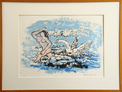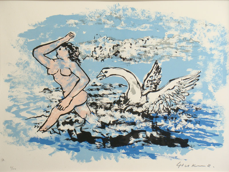福沢一郎さんは戦前から渡欧し、彼の地を席巻していた美術のムーヴメントであるシュールレアリズムの影響を強く受けた方です。後には氏独特の主題の解釈と、その世界観の表現方法を獲得していきました。世界各地を旅する中で、触発されたイメージを作品にしていったわけでしょうが、ギリシャ神話に出てくるレダと白鳥のストーリーもそのひとつだったのかもしれません。白鳥に化身したゼウスがスパルタ王の妻であるレダを誘惑する、と云うもののようです。
