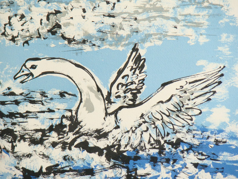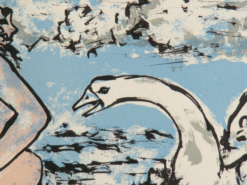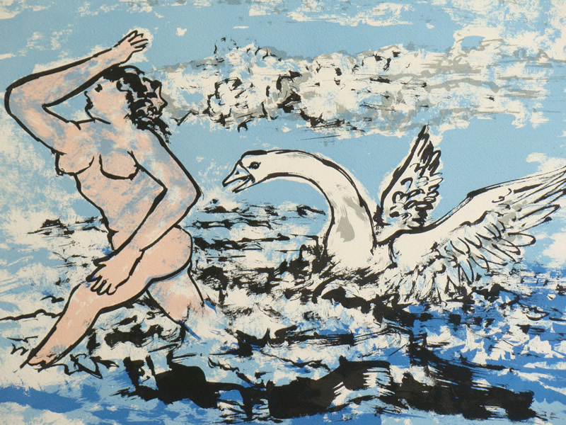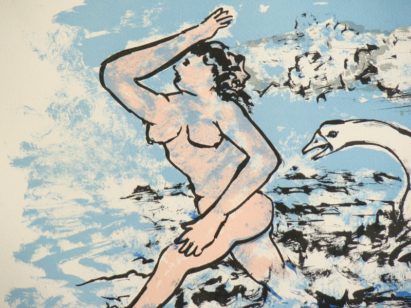 この画面も、湖面の浅瀬を走るレダと追いかけるゼウスである白鳥が、力強いタッチとさわやかなブルーでまとめられ、清涼感を覚える作品に仕上がっています。