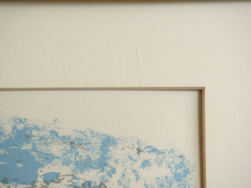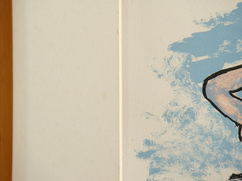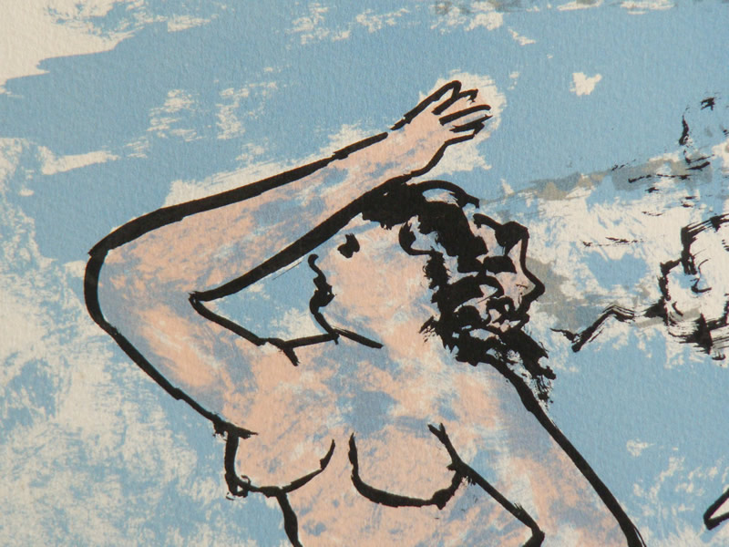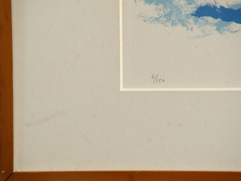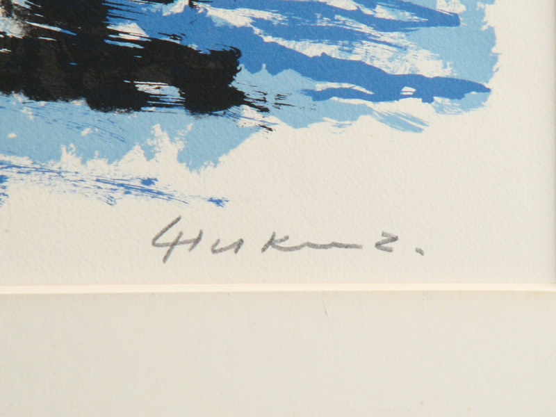 早くから版画の有効性に気付いた氏は、数多くの版画を制作していますし、独特の魅力を醸す、リトグラフのための表現を工夫していったようです。即興的に筆を走らせていったときに生まれるダイナミズムを、余白を多用した画面にストレートに移しとろうとしたのでしょうか、この作品もそのようなエモーショナルな高まりが、前述した清涼感と共に愉しめるものになっています。