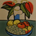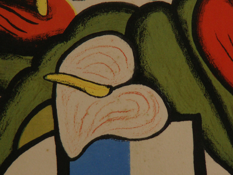 明快な静物の色の構成と配置、それらをまとめる力強く太い線の主張、もう何もコメントのしようもないというくらい、ストレートに訴えかける作品です。アンスリウムが活けられ、手前のテーブルにはフルーツが盛られていますね。長谷川潔さんの「白昼に神を視る」ではないけれど、静物ひとつひとつに神秘的な隠された意味があるのかも?それともメキシコの強烈な太陽光のもとですごした作者にとって、色彩の配置が心地よいリズムになって、私たちのもとへ届く事を願っての絵なのか?どちらもありだなと思える作品ですね。