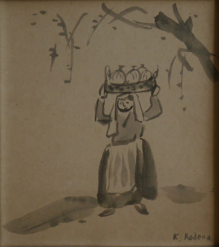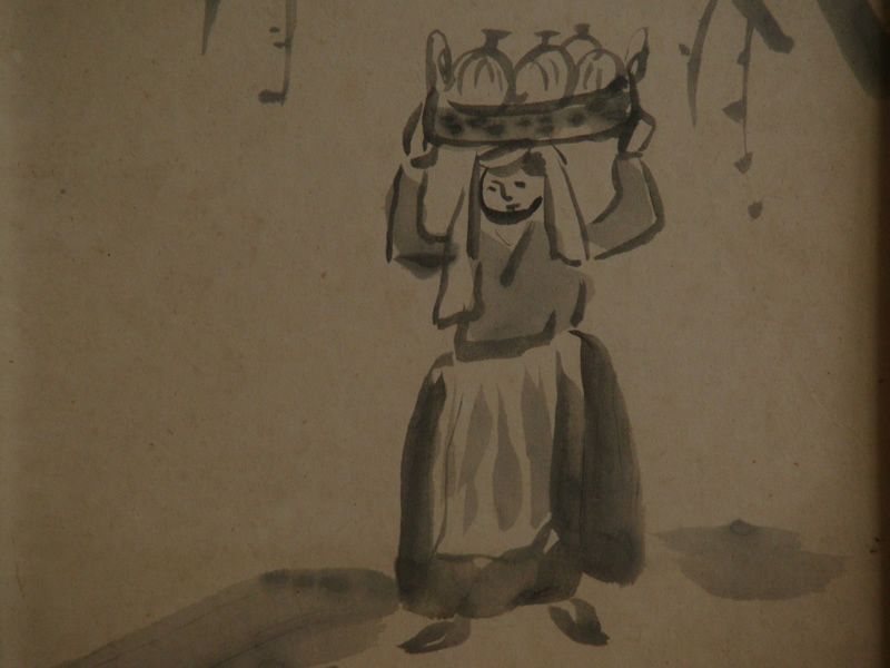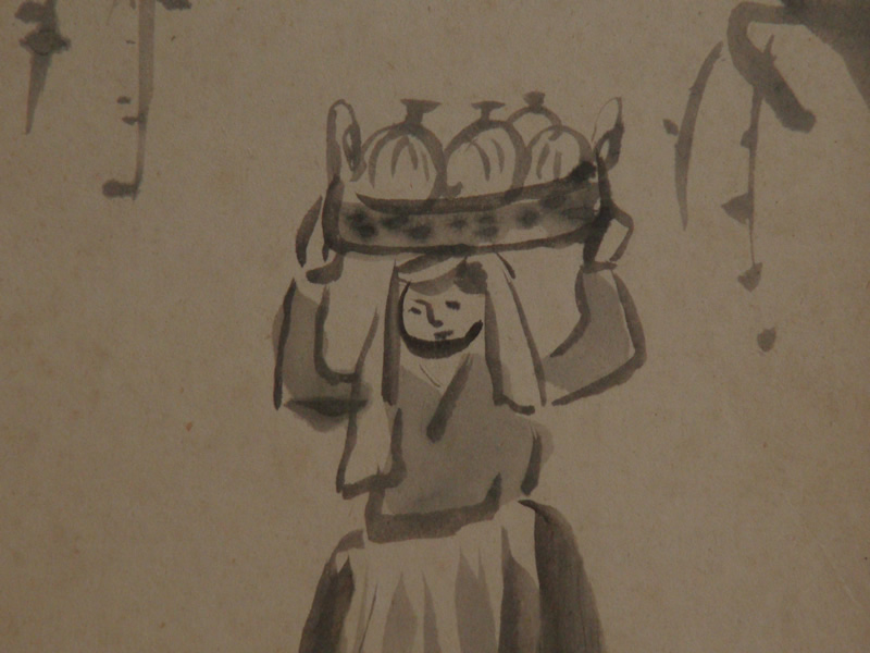 小寺健吉の小品ですね。淡い炭で大原女を描いています。頭の上にのせているのは果物かな?バックには柳の木が配されています。色紙に描かれたものですから、作者も気張らずに鼻歌まじりに自由に筆を走らせたんでしょう、それだけに軽みのある絵に仕上がっています。童画のような素朴な人物を、作者にならって気張らずに飾って頂けたらと思います。